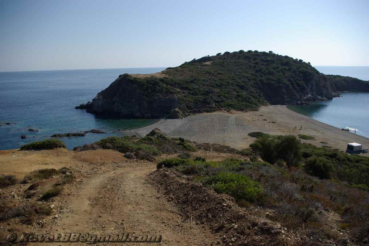 A Chalkidiki félsziget középső ágának legdélebbi strandja. Egy darabig rendes úton, majd földúton lehet megközelíteni. Persze nem teljesen, a végére marad egy kis gyaloglás is. Amikor ott jártunk, bérelt autóval, egy kis városi kocsival (nem terepjáró) közelítettük meg. Nem erőltettem az autót, csak addig mentünk vele, amíg teljesen biztonságosan tudtunk haladni.