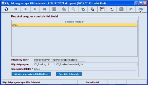 A Speciális feltételek panel a Képzési program alapadatai panelen a
