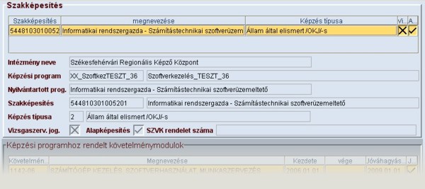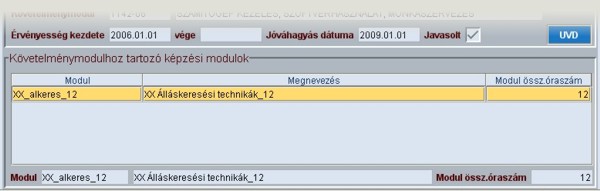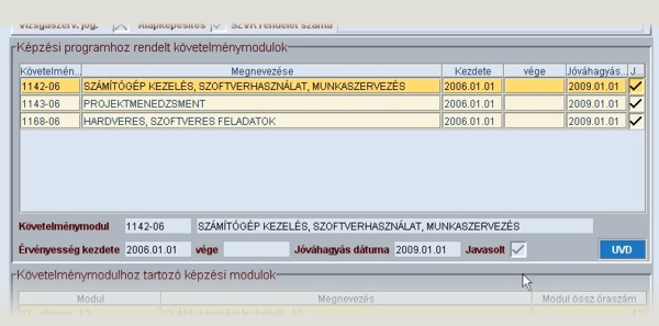 Az alsó képernyőrészben a kiválasztott követelménymodulhoz rendelt modul látható.